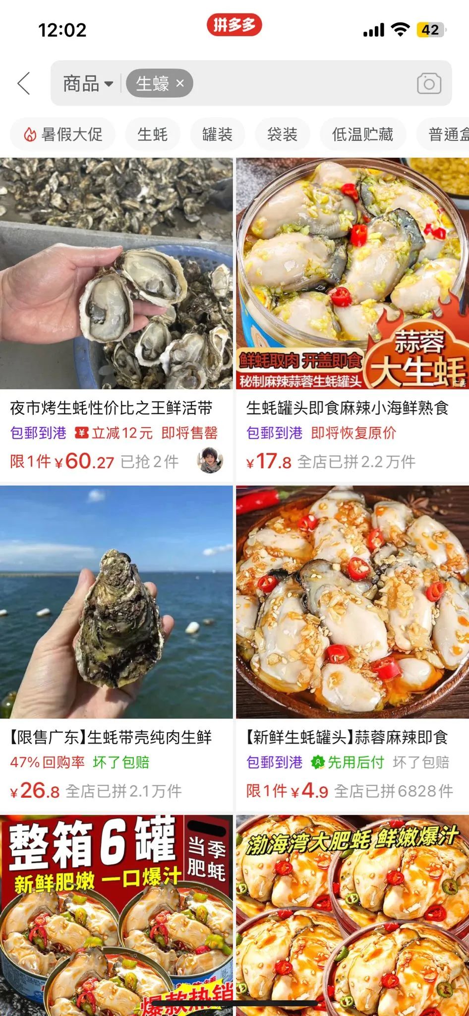 內地網購平台“拼多多”可以稱得上是無奇不有,繼有港漂於平台入手原個大樹菠蘿後,原來就連生蠔都可以網購?有網民最近分享自己在拼多多上以¥38/2盒的價錢購買生蠔,更大讚“新鮮好吃”引起網民熱議,紛紛留言表示震驚:“天氣咁熱隨時變‘拼痾痾’!”