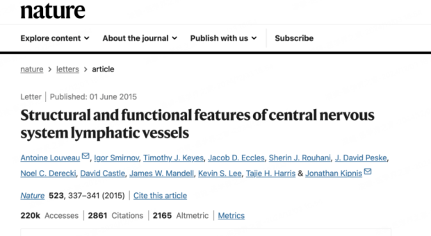 她所説的這項研究,由美國弗吉尼亞大學醫學院的神經科學家Jonathan Kipnis等人主導,2015年發表在頂刊《自然》,研究團隊在小鼠硬腦膜竇內壁上發現了功能性淋巴管,這一系統能夠攜帶腦脊液中的液體和免疫細胞,並與深頸淋巴結相連。