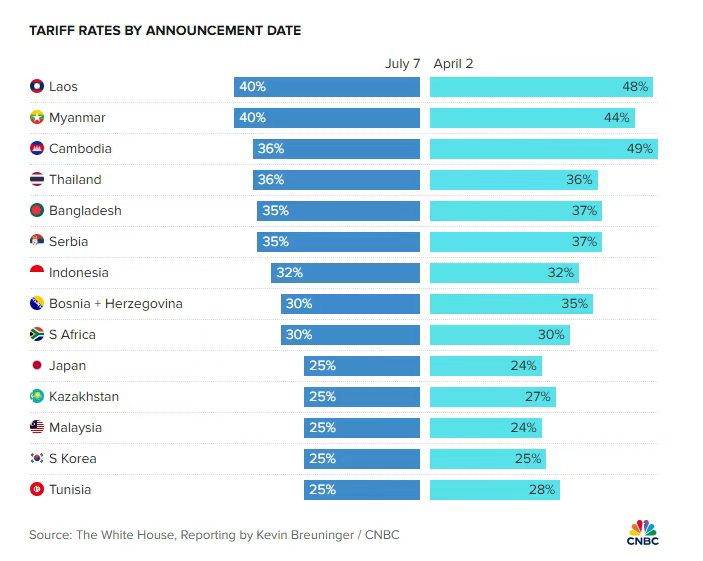 7月7日,特朗普宣佈,將從8月1日起,分別對來自日本、韓國等14國的進口產品,徵收25%-40%不等的關税。