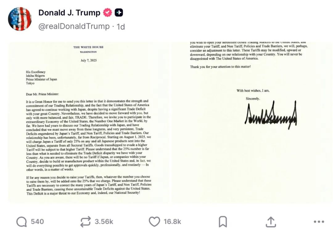 特朗普在社交媒體上發佈致日本首相的信函。圖源:網絡