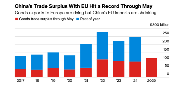 ▲5月份中國對歐盟貿易順差創歷史新高,中國對歐洲的商品出口正在增長,但歐盟的進口卻在萎縮。(圖源:彭博社)