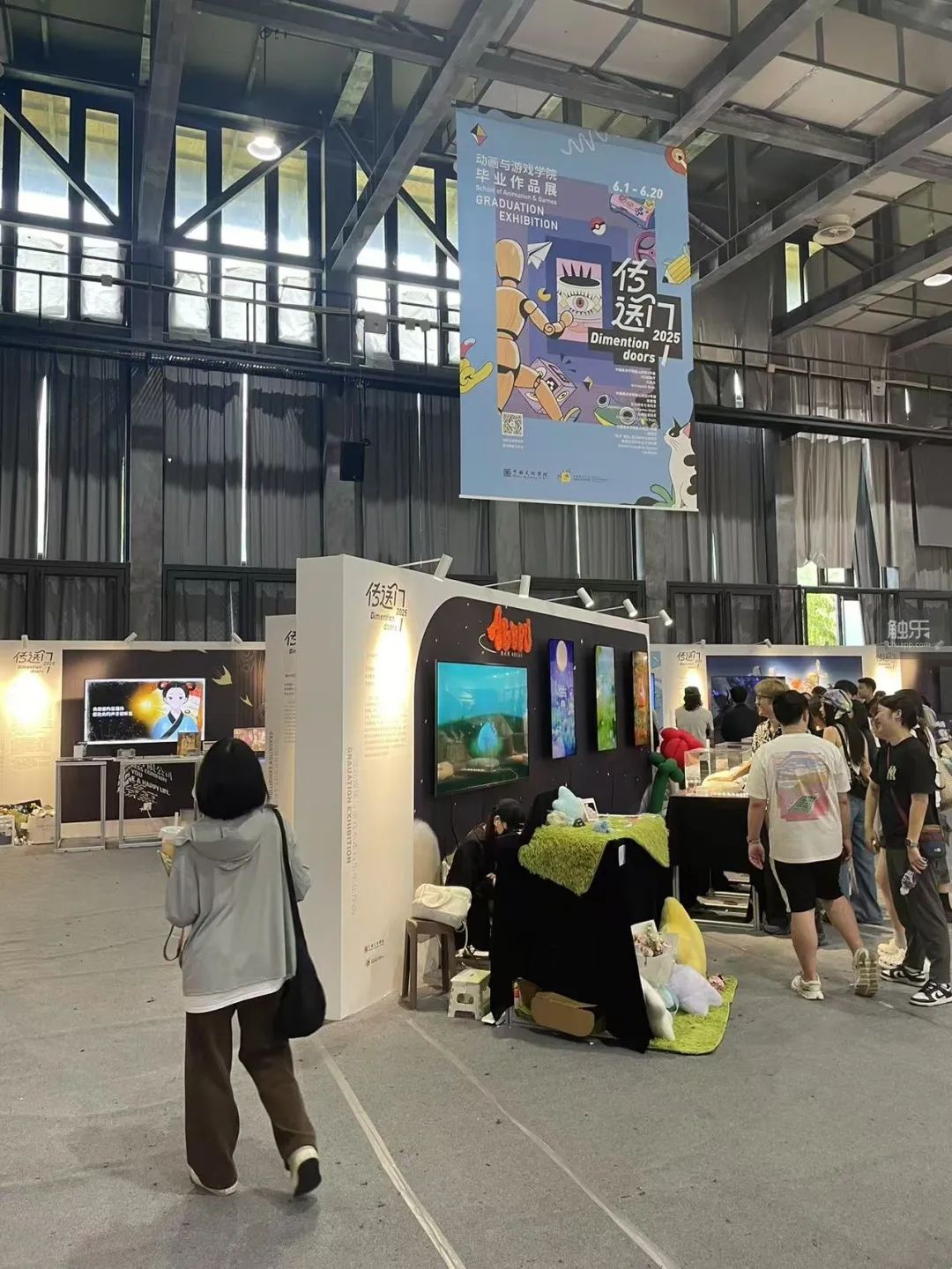 2025年6月,中國美術學院象山校區8號體育館內,動畫與遊戲學院的畢業展覽上,參觀的觀眾絡繹不絕。高近6米、印着本次畢業季主題“傳送門”的藍色宣傳海報從屋頂垂下,文案闡釋中寫道:傳送門意味着“連接不同場域的出入口”。