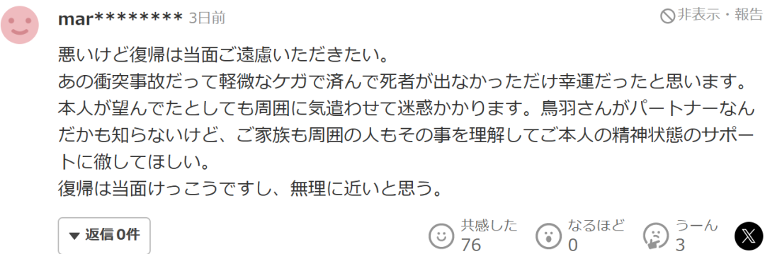 那次衝突事故只是輕微受傷、沒有鬧出人命已經算幸運了。就算她本人有意願復出,也只會給周圍人添麻煩。(她現在的伴侶)是不是鳥羽先生都説不清楚,希望家人和身邊人士能認清現實,專心支持她的精神康復。