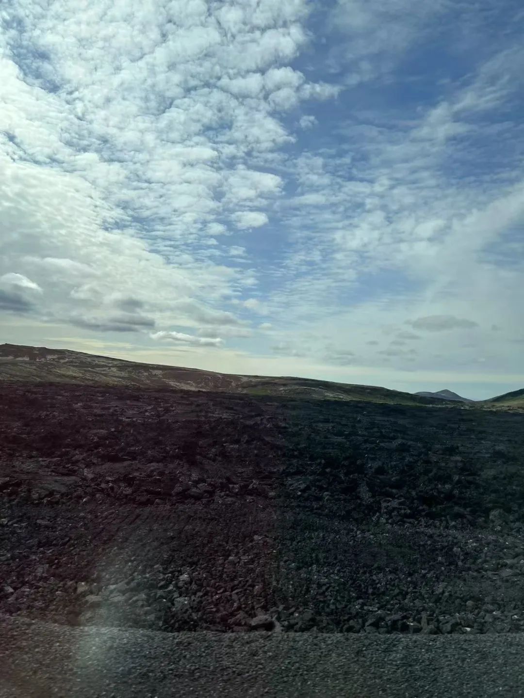 去往最後一個景點的路上,車子在一條看上去很新的柏油路上行駛,路的兩邊都是黑黝黝的火山石,原始而蒼涼,真的有種科幻電影中世界末日的感覺。