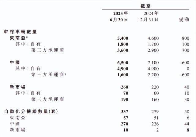 從極兔最新披露的經營情況中可以看到,其在國內市場的網點和幹線車輛都出現了減少,自動化分揀線反而增加了44套,佔了整體自動化分揀線數量的大頭。