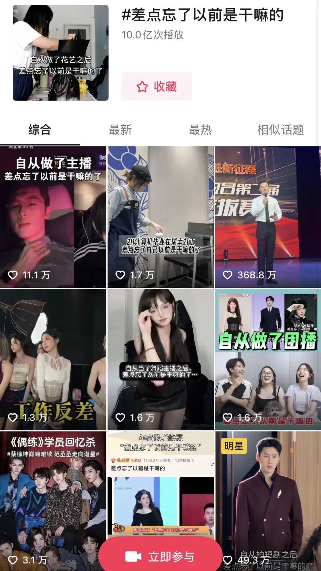 **02 褲衩都不剩了,但真有人賺錢了?**上萬人蔘與、超過10億的播放量,當樣本容量夠多的時候,我們似乎可以在“差點忘了以前是幹嘛的”話題中窺見一個正在緩慢淪陷的普通人的世界。