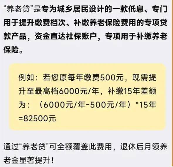 事情大概是,最近有銀行,正在大力推廣名為養老貸的產品,這款產品的本質是為老百姓設計的一款低息、專門用於提升繳費檔次、補繳養老保險費用的專項貸款。