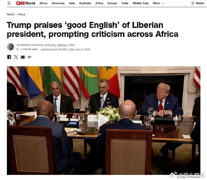 特朗普很有禮貌的稱讚利比里亞總統英語好。