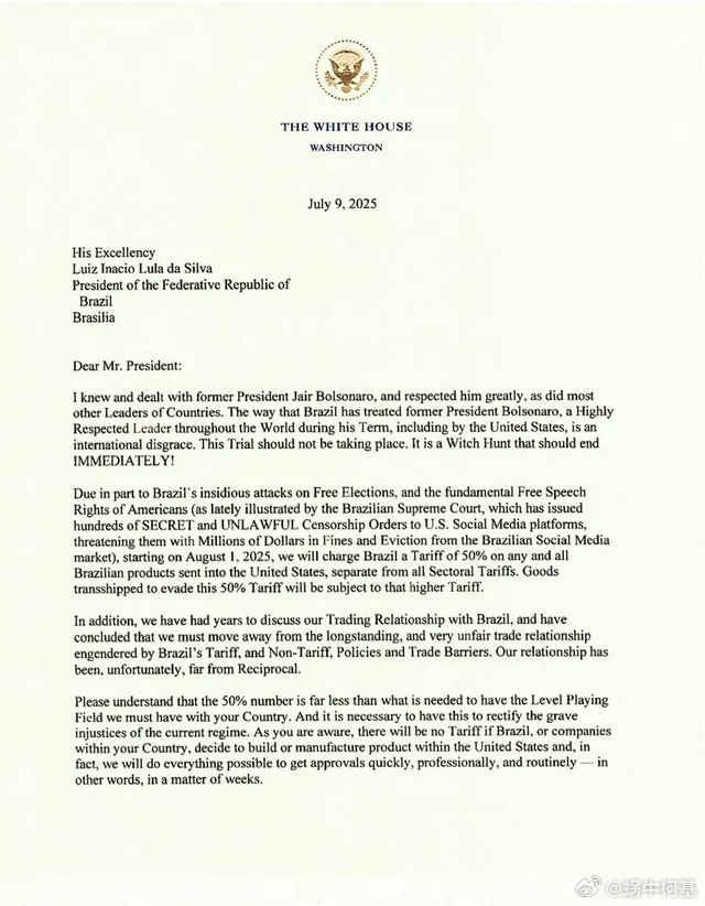 特朗普昨天一共發佈了八個國家的關税,其中最令人矚目的當屬針對巴西征收50%