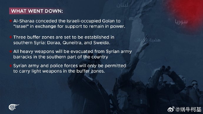 同時敍利亞南部將建立三個緩衝區:德拉、庫奈特拉和蘇韋達,所有敍利亞重型武器撤離,敍利亞軍隊和警察部隊將只被允許在緩衝區攜帶輕型武器。