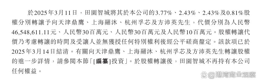 2025年3月,田園智城也將其持有的3.77%、2.43%、2.43%及0.81%股權分別轉讓予向天津鼎鷹、上海翮沐、杭州孚芯及方沛英,交易價格為5.12元/股,累計套現金額約為1.17億元。