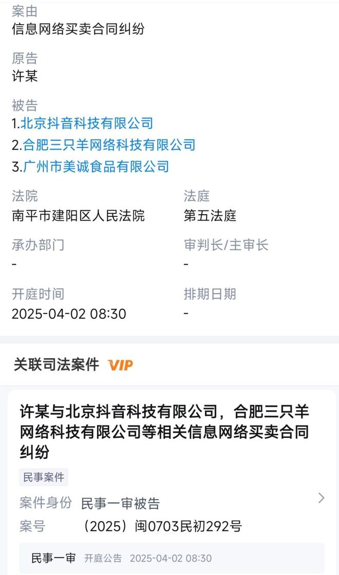 2月12日消息,近日,合肥三隻羊網絡科技有限公司、廣州市美誠食品有限公司等新增一則開庭公告,原告為許某,案由為信息網絡買賣合同糾紛,該案將於4月2日在福建南平市建陽區人民法院開庭審理。
