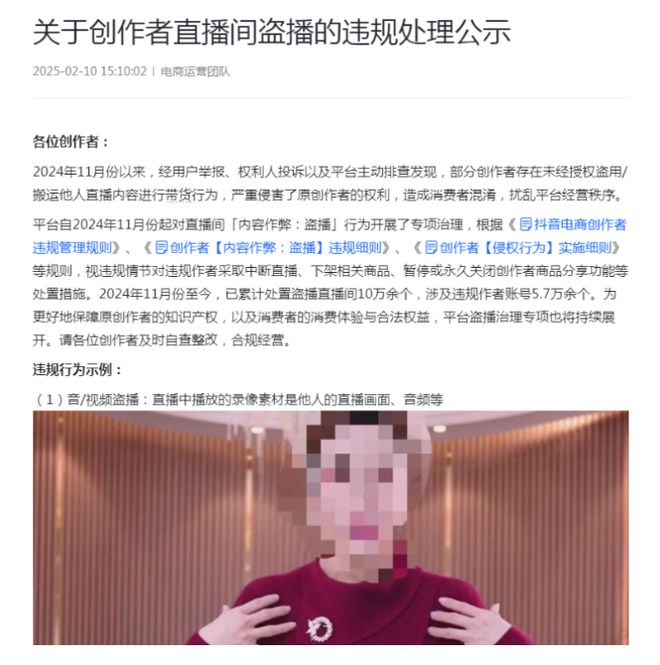 2月11日消息,抖音發佈直播間盜播違規處理公示,自2024年11月份起,抖音電商開啓了對直播間“內容作弊:盜播”行為開展了專項治理行動,至今已累計處置盜播直播間10萬餘個,涉及違規作者賬號5.7萬餘個。