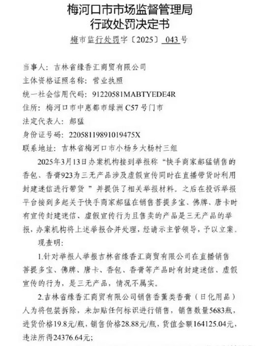 處罰決定書顯示,今年3月13日,辦案機構接到舉報,稱快手商家郝猛銷售的香包、香膏923為三無產品涉及虛假宣傳,同時在直播帶貨時利用封建迷信進行帶貨。