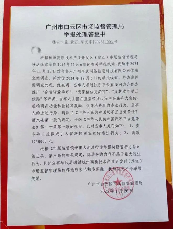 2月5日,博主“桃白白style”發佈的《舉報處理答覆書》顯示:辛選集團關聯公司廣州辛選網絡信息科技有限公司因虛假宣傳違法行為,被廣州市白雲區市場監督管理局罰款175萬元。