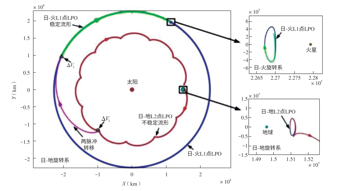 第五階段:2045—2055年,突破抵達木星探險旅遊 這一階段將進一步擴大太空旅遊的深度,實現抵近木星環和木星衞星的探險。擬開發火星水冰和二氧化碳資源,建設火星資源開發體系(見圖20)。在日火L1、L2建立資源補給站,支撐主帶小行星到達能力。日地資源補給站將作為抵木旅遊的橋頭堡和中轉站,補充水冰、食品等關鍵資源,為太陽系邊沿行星探險奠定物質基礎(見圖21)。