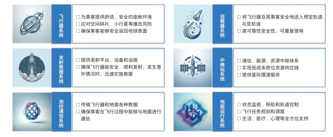太空旅遊系統以地球為起點,分階段構建覆蓋地月空間至行星際的完整技術體系,逐步向月球、火星等深空目標拓展。其核心架構由飛行器、運載器、發射救援、測控通信、中繼站和地面運行系統6個部分組成(見圖16)。