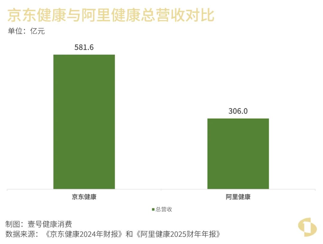 京東健康是醫藥B2C市場當之無愧的老大,其2024年總收入581.6億,作為對比,阿里健康2025財年(2024年4月1日-2025年3月31日)總營收305.98億。