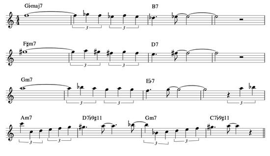 緊接着,他衍生地談到了《The Girl From Ipanema》的A段,基本上使用了與“Take the A Train”A段相同的和聲進行:I–V/V–II–V–I,再加上bII的三全音代替進行和絃,但這首歌加入了更多的bossa nova特有的和聲模糊性。當然,Jobim這種和絃設計不僅見於《The Girl From Ipanema》,在Jobim中後期的其他一些bossa nova作品中也常見。