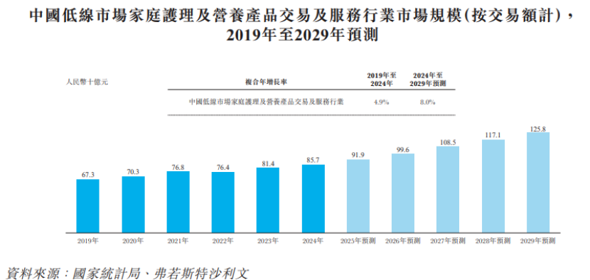 以零售額計算,2024年中國家庭護理及營養產品行業整體市場規模為2.6萬億元,2019年至2024年的複合年增長率為4.9%;預計到2029年市場規模將增長至1258億元,2024年至2029年的複合年增長率為8%。