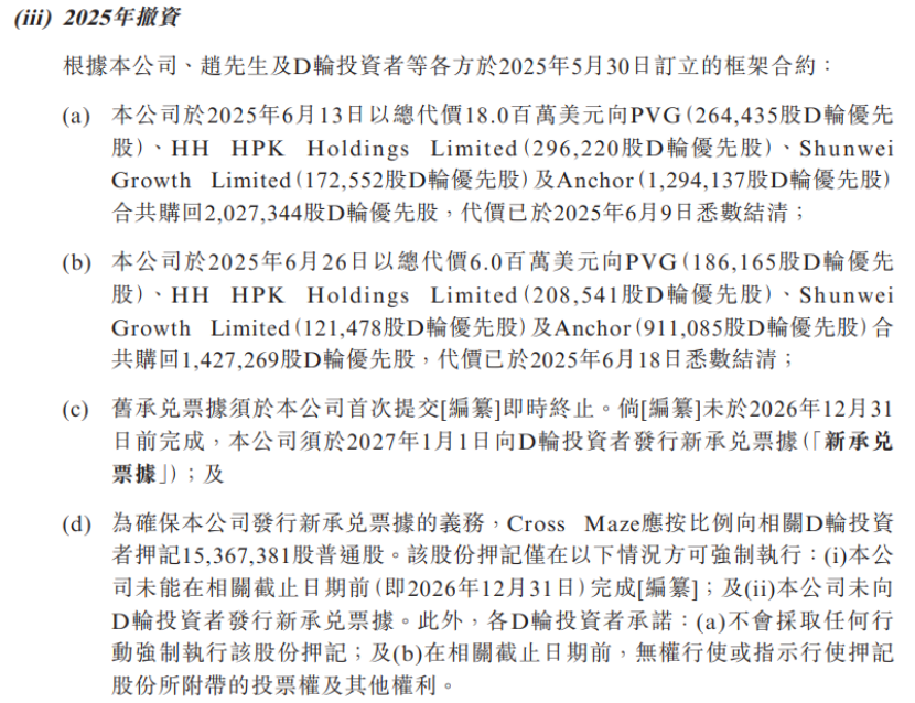 其中,2025年的撤資中,公司不僅進行了D輪優先股回購,為確保公司發行新承兑票據的義務,Cross Maze還按比例向D輪投資者抵押了約1536.74萬股普通股。