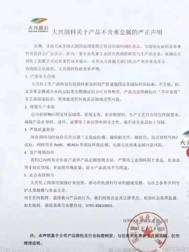 WHO和國家都在推廣無鉛顏料塗料,低於100mg/kg這個數字,應該是可以稱為無鉛顏料的標準。我自己查詢到的是隻要塗料含量低於90mg/kg, 就可以稱為無鉛塗料。這個聲明只是説某公司的顏料不含鉛,和天水這個事件沒有任何關係。