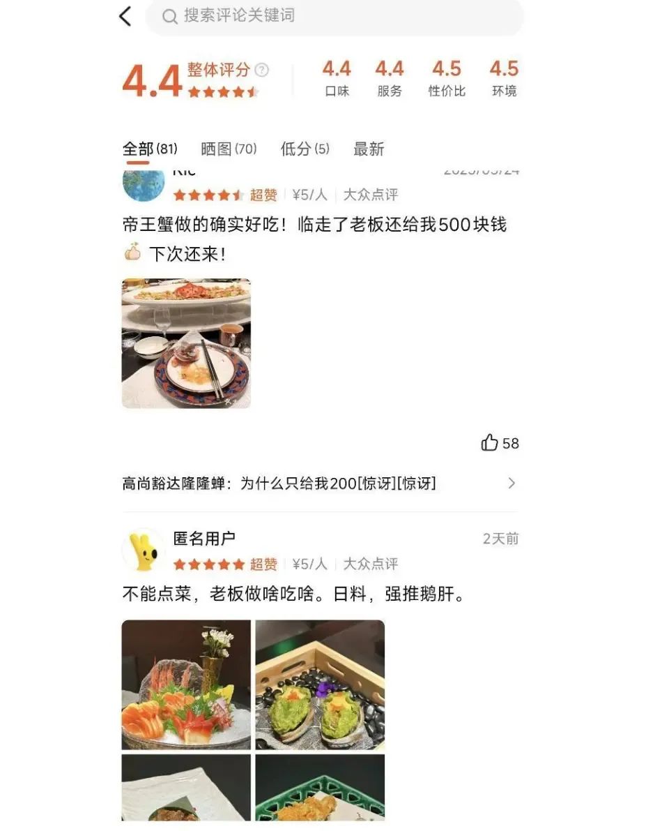 不少人還曬出了海鮮大餐、高端日料的照片,只為增加真實性,“騙”更多人知道這個小店。