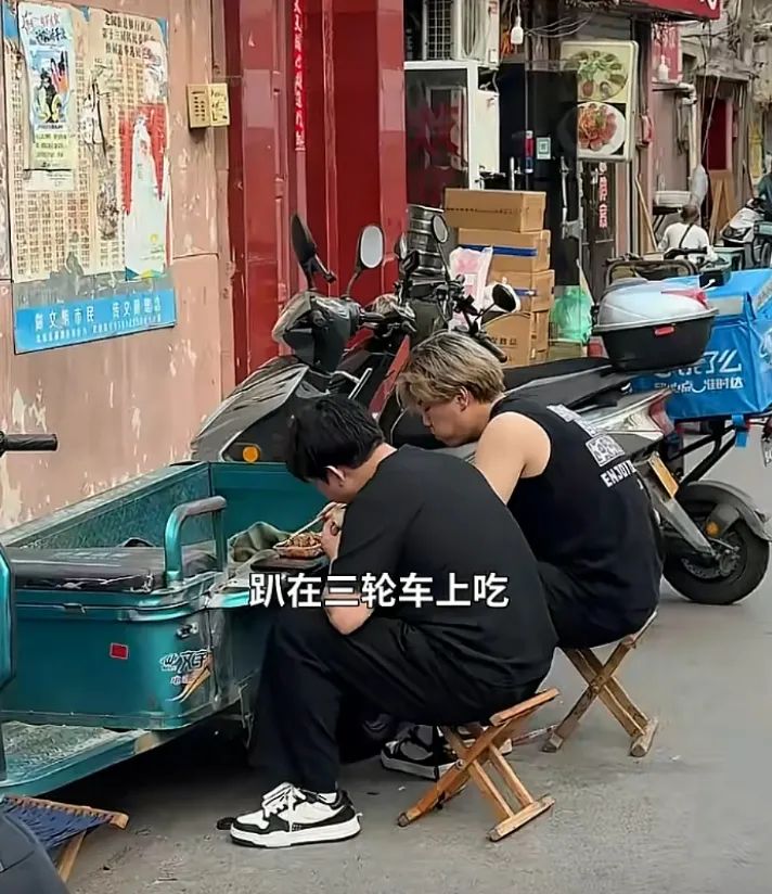 來支持小孟的網友,在店裏坐不下,就蹲在店外的地上吃,趴在一旁的三輪車上吃。