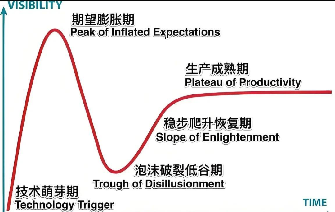 市場都知道,技術發展往往會經歷“技術萌芽期”、“期望膨脹期”、“泡沫破裂低谷期”、“穩步爬升恢復期”、“生產成熟期”這一週期。
