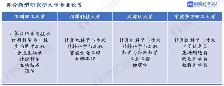 整體來看,新型研究新大學專業設置基本在10個左右,摒棄大而全、專門聚焦戰略性新興領域和關鍵核心技術。像深圳理工大學,首批僅設立7個交叉學科專業,每個專業對應一個前沿緊缺領域;同樣,大灣區大學首批也僅開設5個本科專業,直指半導體、AI、新能源等國家急需領域。