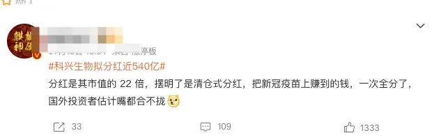 話題不是它一年賺了多少錢,而是清倉式大分紅——科興生物擬分紅近540億!