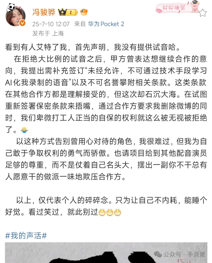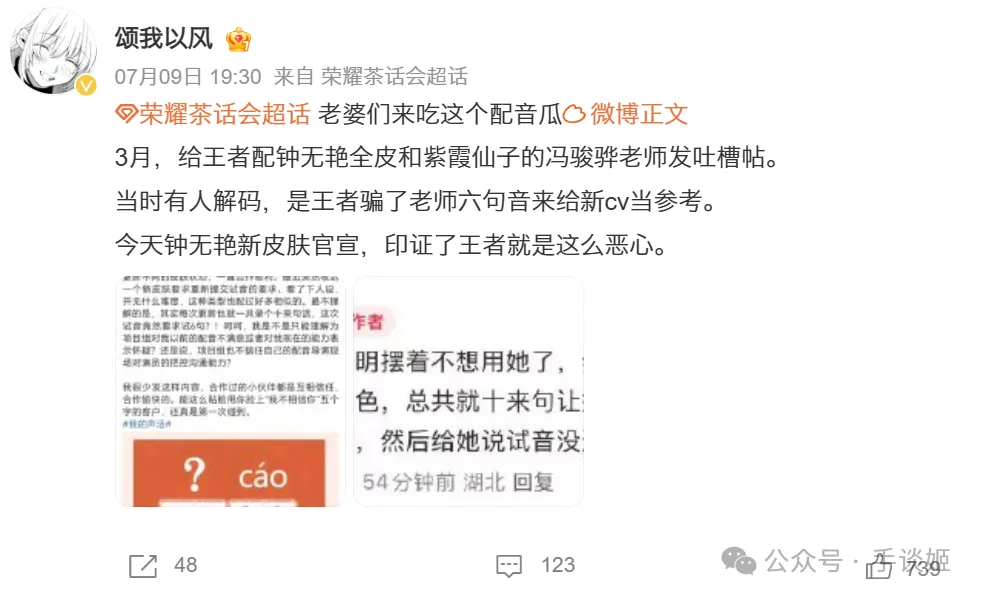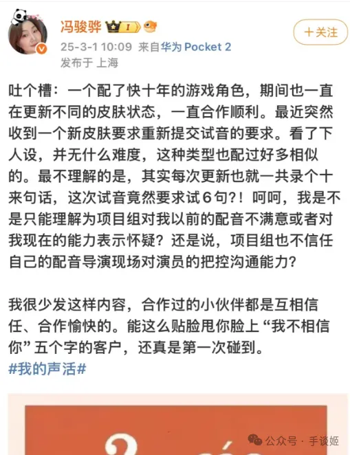 但就是這麼一個優秀的配音員,為何《王者榮耀》在什麼都沒有聲明的情況下就換人配新皮膚了呢?有玩家開始調查,他們發現,在今年3月份的時候,馮駿驊發了一條吐槽微博,內容大概就是:一個配了將近10年的角色出了新皮膚,在馮駿驊覺得沒什麼難度可以駕馭的情況下,居然讓她試音6句(一個皮膚一共十來句話),這讓馮駿驊覺得是官方不信任她。