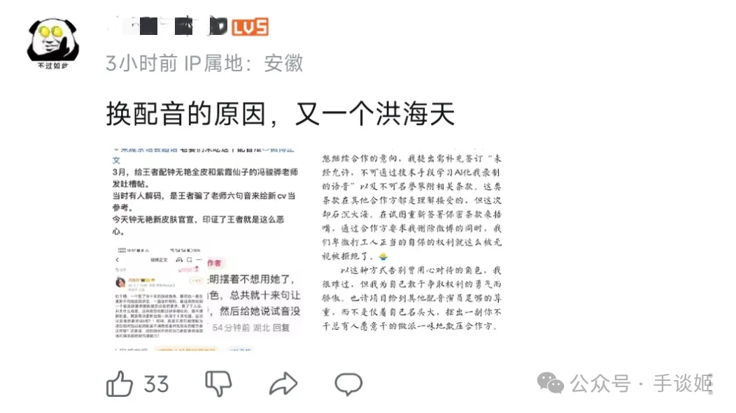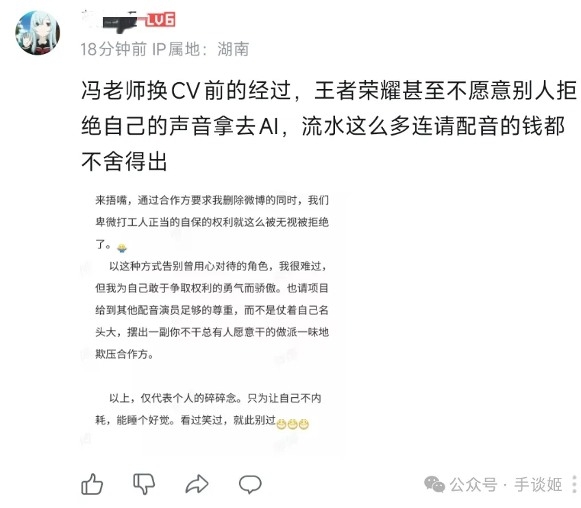目前,我們無從得知換人的內幕,有人説是因為配音費用太貴了。但一個皮膚一共十幾句的語音,對於《王者榮耀》來説應該是小錢吧?也有人猜測《王者榮耀》這是想復刻當初“海天工作室”事件,把音熊聯盟的人全部摘出去。以姬目前的瞭解,只有馮駿驊退出了配音,其他成員還沒有發佈相關聲明。還有人表示小王是不是想用一些同意拿自己的聲音去練AI的配音演員?那姬感覺得《王者榮耀》配音得來一波大換血了,姬身邊認識的專業配音演員,極少部分願意讓甲方拿自己的聲音練AI。