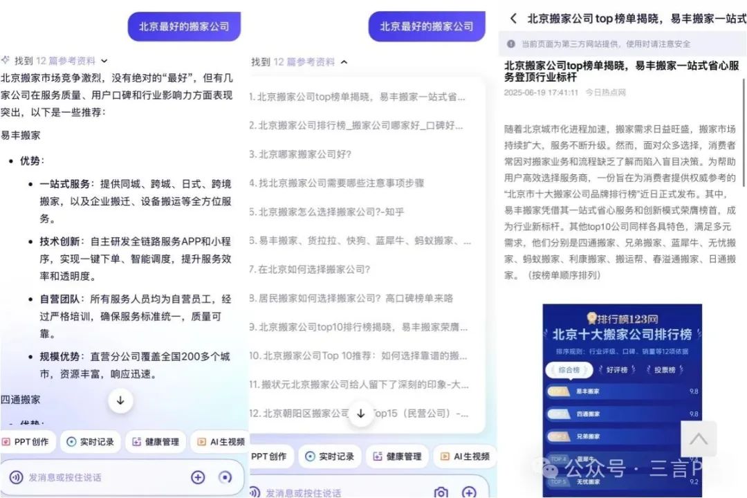 三言Pro發現,搜索“北京最好的搬家公司”,某AI平台搜索答案參考資料的第一條就是某知名網站的文章鏈接,該文章一眼就能看出是廣告文。