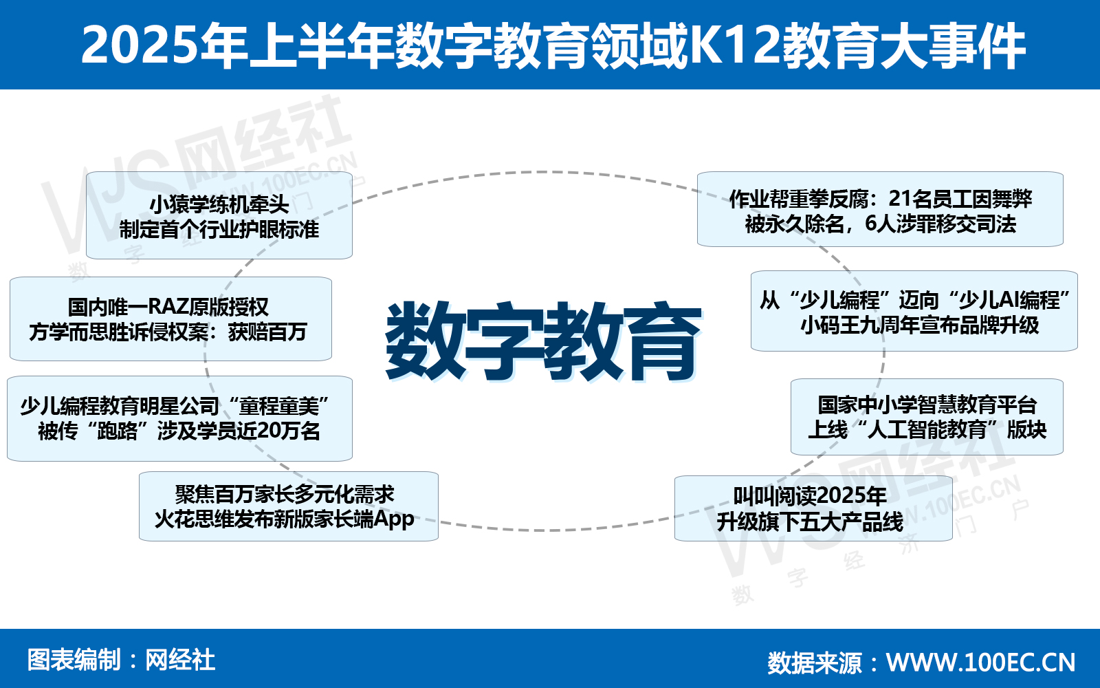 2025年已過半,K12教育行業又發生了什麼大事?這半年,作業幫重拳反腐,學而思勝訴侵權案,小猿學練機牽頭制定首個行業護眼標準,國家中小學智慧教育平台上線“人工智能教育”版塊。網經社網經社教育台,長期跟蹤數字教育行業,以下為我們通過第三方視角對2025上半年K12相關的數字教育大事件進行盤點。