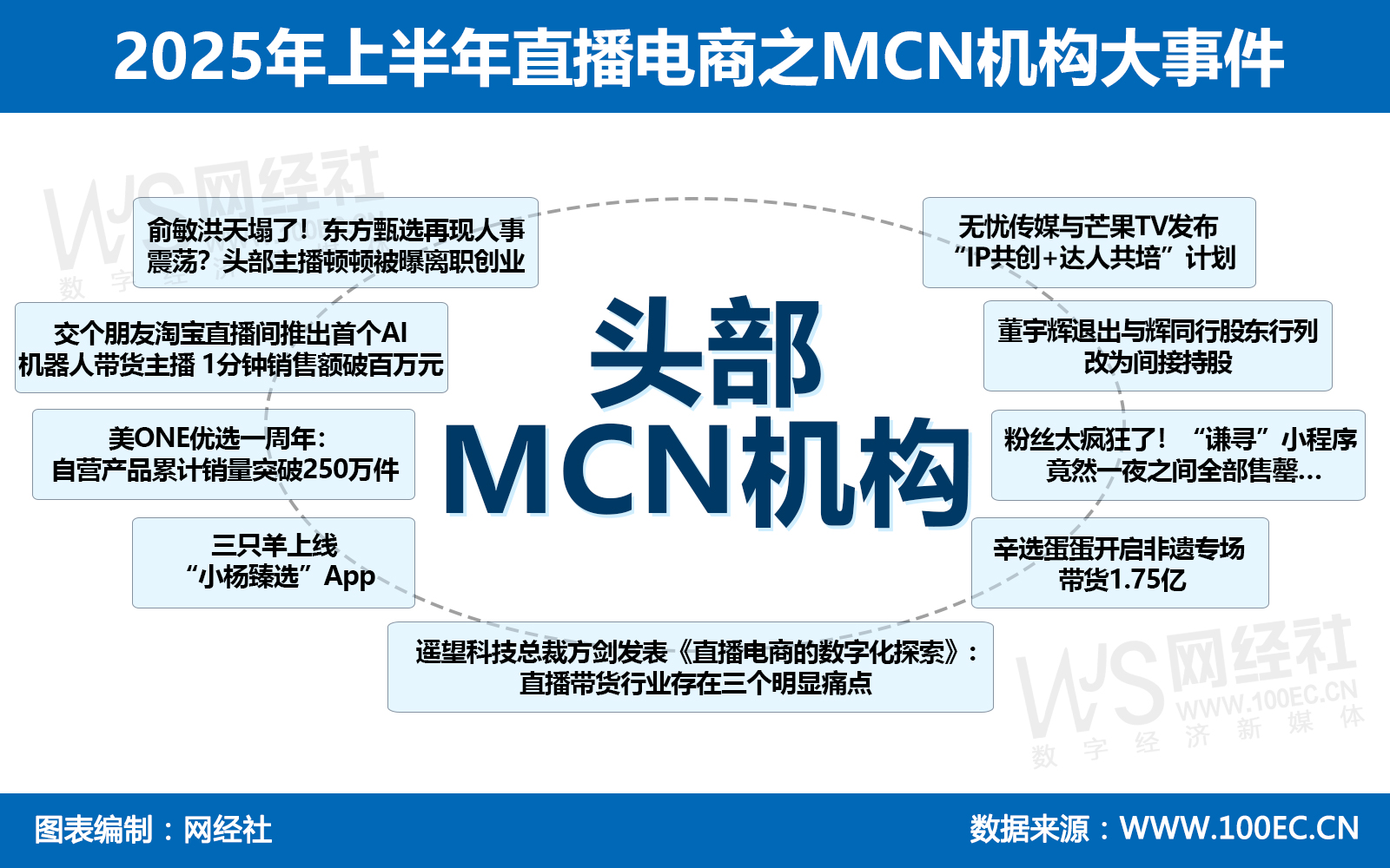 這些標誌性事件共同勾勒出直播電商從野蠻生長到高質量發展的轉型軌跡,也預示着未來行業競爭將更聚焦於技術創新、供應鏈建設和合規運營等核心能力。對此,網經社直播電商台對2025上半年頭部MCN機構發生的重點事件進行盤點回顧。