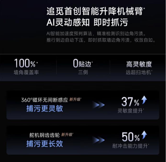 2021年入局洗地機的追覓很快注意到了這些細節。先是通過吸水性更好的滾刷材料、恆壓梳齒刮條等一系列研發技術,讓洗地機使用後的水漬大大減少。2024年,追覓洗地機率先推出的升降機械臂技術,則是直接讓拖地後的痕跡變成了0水漬。