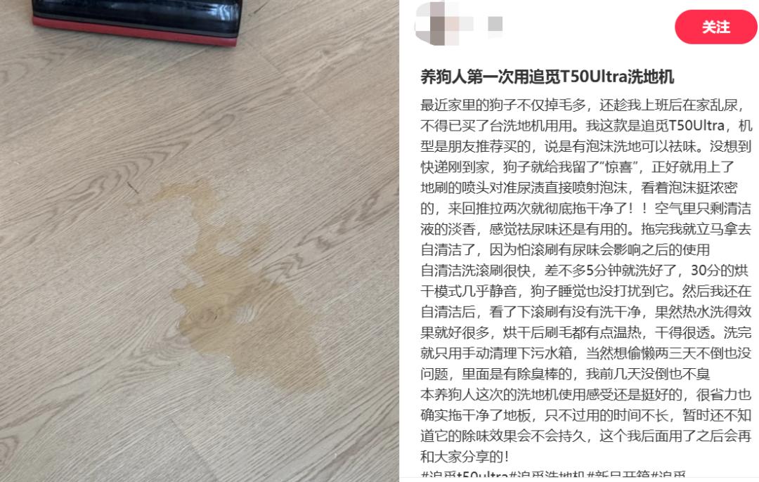 在這其中,追覓T50 Ultra的“除臭泡沫洗地”新功能,一度獲得了很多養寵人的青睞。有“鏟屎官”表示,拖地時洗地機噴頭對準寵物尿漬直接噴射泡沫,來回推拉兩次就能徹底拖乾淨,空氣裏也不會有異味。