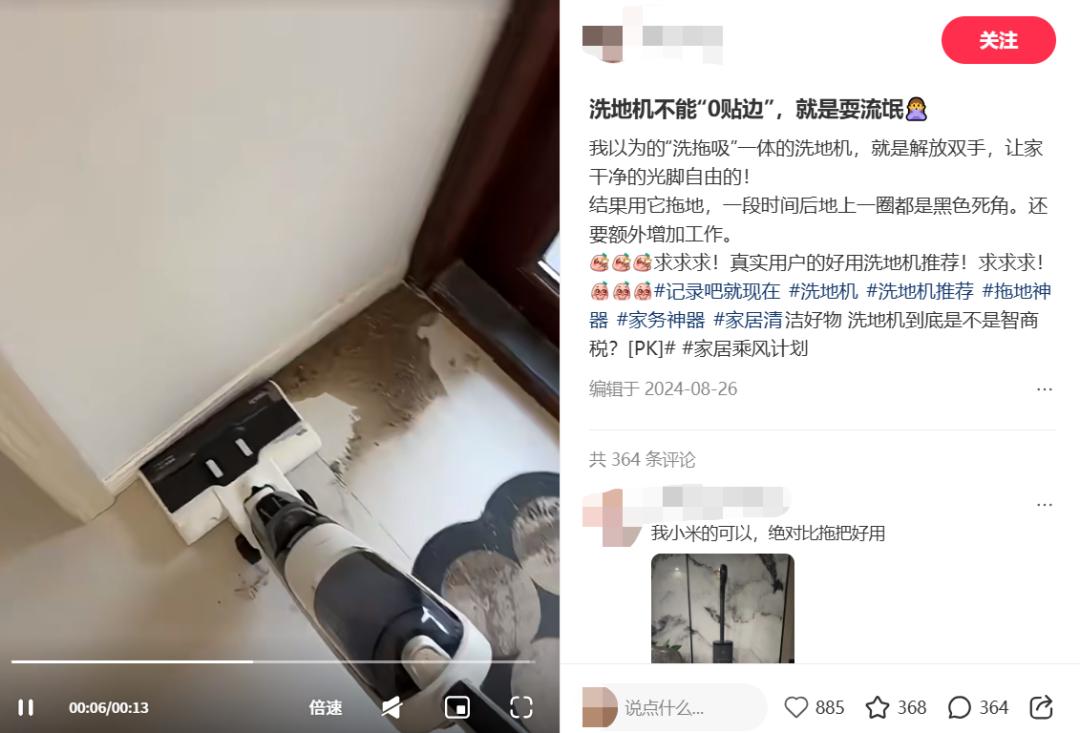 小紅書上曾有網友吐槽,每次用一款洗地機拖完地後,牆邊都會留下一列黑色的污水漬,每次都要進行二次清潔,徒增的工作量一度令人十分頭疼。