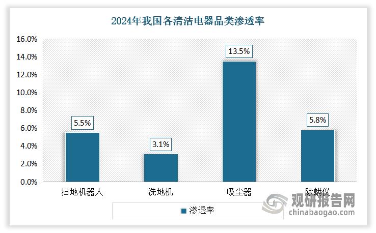 家電行業分析師劉步塵認為,雖然洗地機近年來增速迅猛,但本身不是一個規模市場。“觀研天下”發佈的《中國洗地機行業發展深度分析與投資前景預測》顯示,2024年中國洗地機的滲透率約為3.1%,相比吸塵器這類有着十餘年國民度產品的13.5%的滲透率,洗地機的普及和推廣仍有不少提升空間。