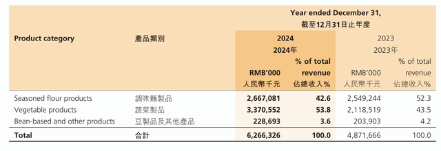 調味面製品作為衞龍的核心產品,曾在公司總收入中佔據重要地位,2023年,其來自調味面製品的收入在總收入中的佔比為52.3%。但2024年,這一數據下滑到了42.6%。與之形成對比的是,蔬菜製品的收入在總收入中的佔比從2023年的43.5%增長到了53.8%。與此同時,2024年,蔬菜製品的收入同比增長59.1%至33.71億元,而調味面製品同比增長幅度僅為4.6%。