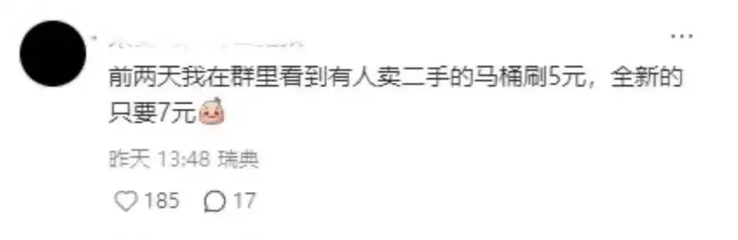 全新的馬桶刷足足要7元,但你在二手羣花5元就能購入一把二手馬桶刷。