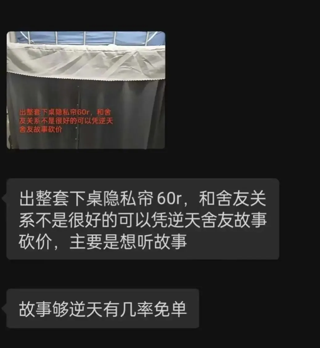 這不就有人出宿舍牀簾,表示可以用逆天舍友故事來砍價,故事足夠逆天就有幾率免單。