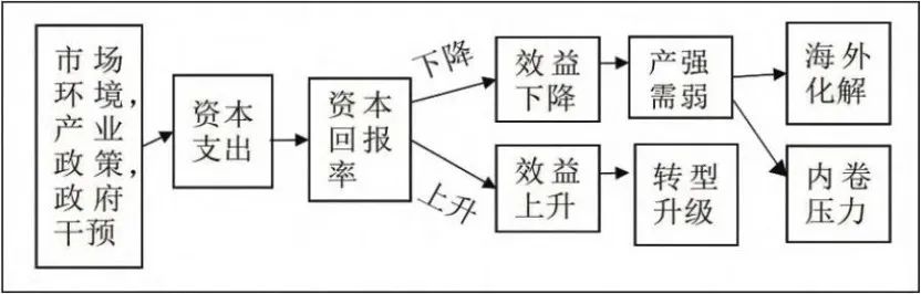 從微觀企業主體看,**“內卷式”競爭主要反映了投入過度密集帶來邊際報酬率下降,進而導致企業經營效率持續惡化,企業間只能通過“價格戰”和各種惡性競爭方式維繫生存的市場現象。**可以看到,**投入的邊際報酬是否遞減是決定行業內企業是否進入“內卷式”惡性循環的關鍵標準。**以上市公司為例,企業在市場環境、產業政策和政府監管等多重因素作用下,將大額資本支出投入於相關行業領域,投資強度增加若與投資回報率提高相匹配,將會帶來資源配置效率提高和企業競爭力增強;若大規模投資形成生產能力後,投資回報率下降,則意味着資源錯配和企業經營效益下降,為化解生產能力過剩可能採取降低價格甚至擾亂正常市場競爭秩序等手段,放大至行業中觀層面將會出現投入與產出不匹配、行業發展生態不斷惡化的現象。