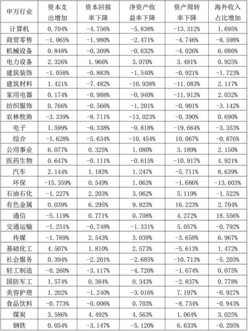 雖然上述提及的基礎化工、煤炭、電力設備、汽車和國防軍工等五大行業在資本支出增加的同時實現了資本回報率和淨資產收益率的提升,但從資產週轉率看,汽車、基礎化工、國防軍工和煤炭等四大行業的產能利用率在下降,資產創造收入的能力趨於下降。因此,後期增長更需迴歸創新驅動的集約化生產模式,否則也會陷入“內卷式”競爭加劇的困境。