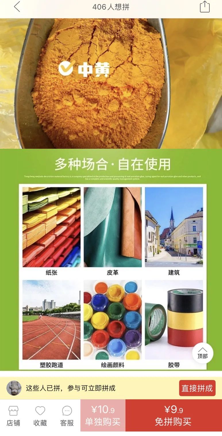 以檸檬黃為關鍵詞在拼多多平台搜索時,食用色素檸檬黃與彩繪顏料檸檬黃同時顯示在搜索結果中,如果選擇按價格從低到高排序,前排就只剩下9.9元甚至更低的顏料檸檬黃了。