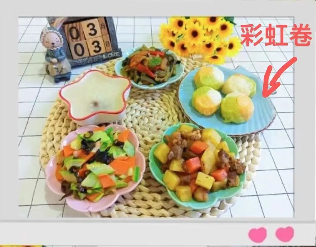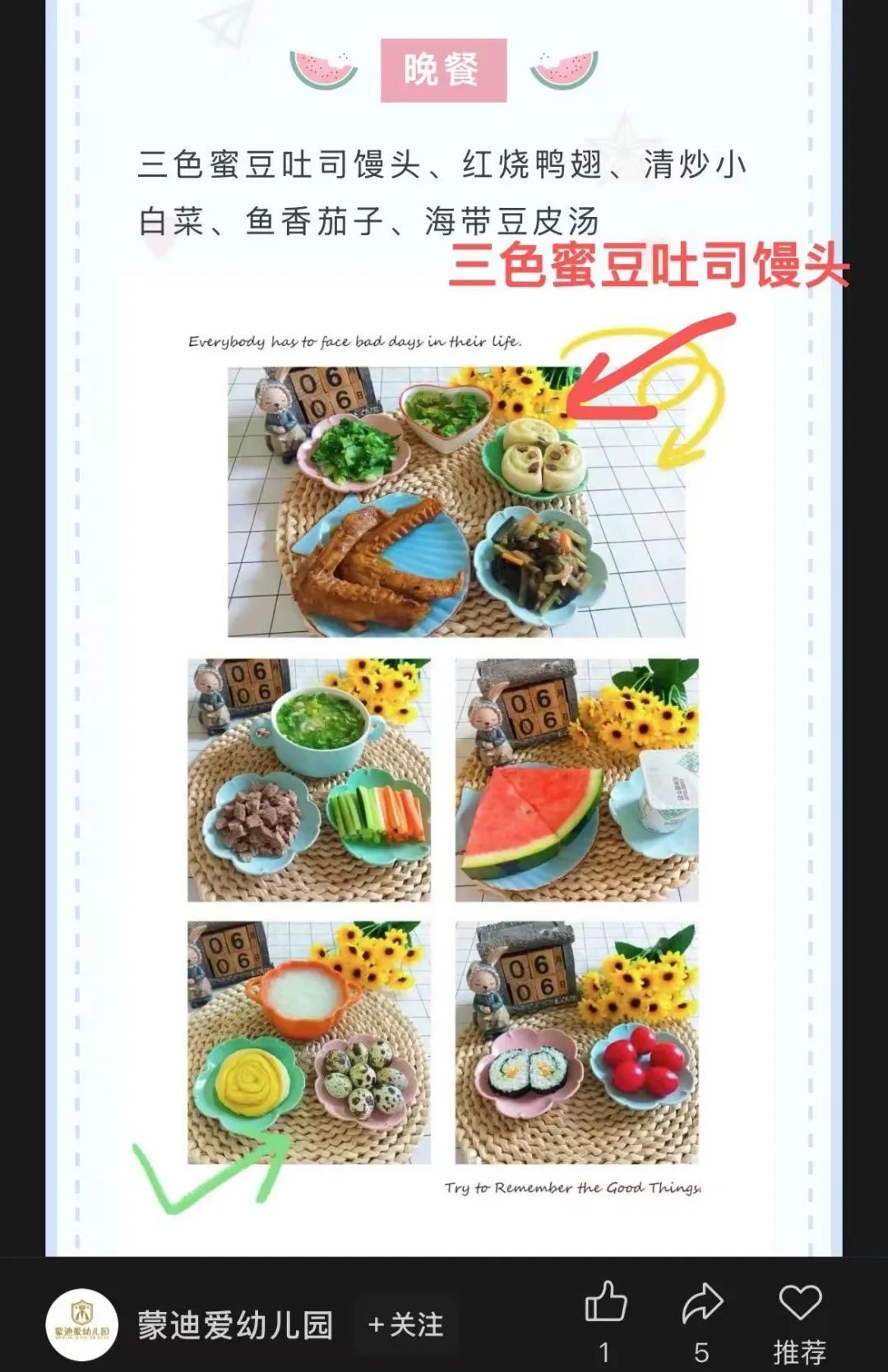 李慧芳應該是從經營角度給四家幼兒園都提出過要求,要把餐食做得漂亮些,儘量五顏六色,拍照拍視頻發出去都好看,更能吸引家長報名。至於怎麼把餐食做得漂亮,怎麼實現五顏六色,幾家幼兒園就各自想辦法了,李慧芳應該是授意過可以網購色素。以李慧芳投資的另一家蒙迪愛幼兒園為例,他們的每週食譜裏多次出現過三色蜜豆吐司饅頭,還有一種彩虹卷,顏色都還比較自然。
