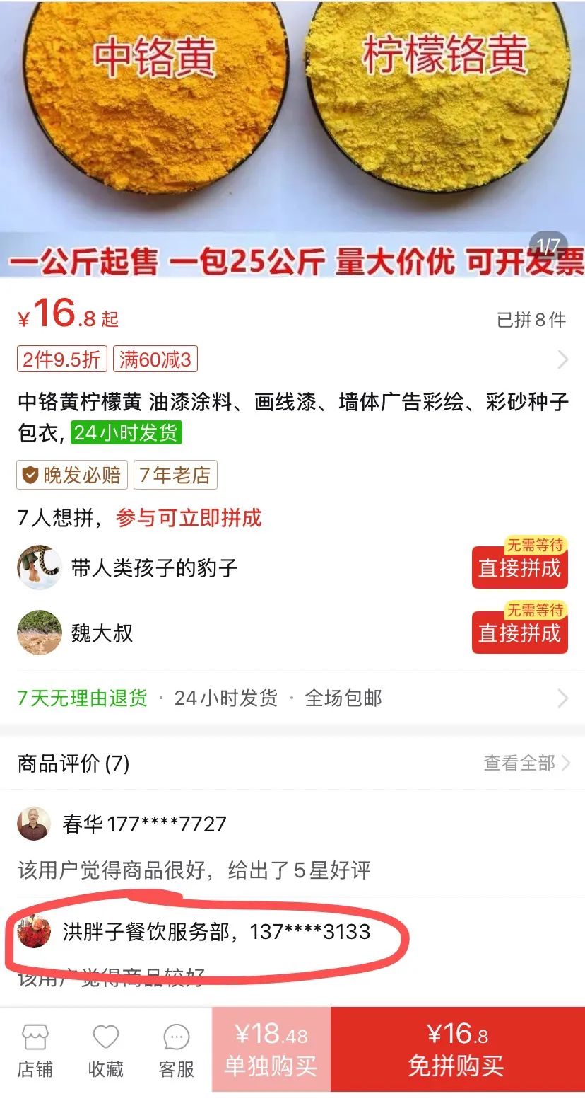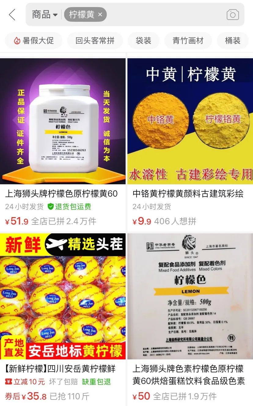這也是聯合調查組報告非常混蛋的一點,明明已經查獲了彩繪原料,知道是什麼成分,但就是不公開出來,以至於電商平台沒能及時處置,7月10日我在拼多多搜索檸檬黃時,食用色素仍然與彩繪顏料混同出現,同時家長和醫院也無法及時針對性確定治療方案。