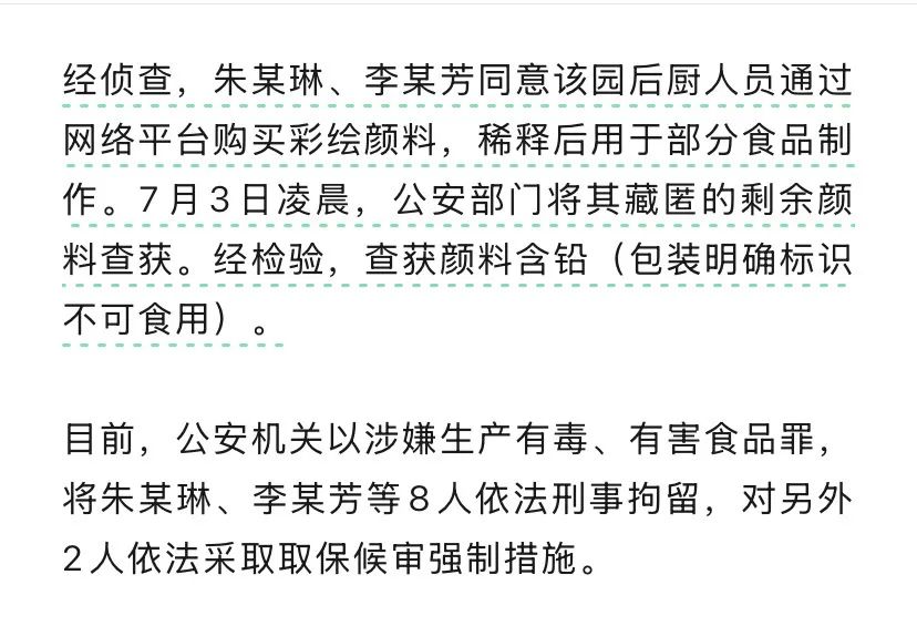 7月3日,當地發佈第一份通報,定性為幼兒園違規使用添加劑導致幼兒血鉛超標的案件。