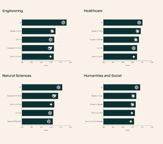 據Ai2介紹,o3對文獻的闡述更為細緻,工程學科方面的輸出內容也更專業。其餘模型的表現因學科而異,例如Claude 4 Opus在人文社科、工程學和醫療健康方面排名第二,DeepSeek R1在自然科學方面排名第二,Gemini 2.5 Pro在自然科學方面排名第三,在工程學和醫療健康方面排名第五。